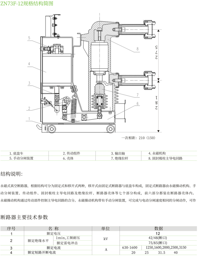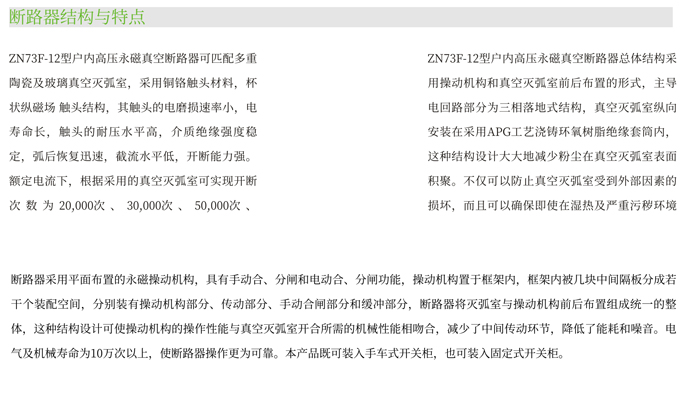 ZN73F-12型永磁機(jī)構(gòu)戶內(nèi)高壓真空斷路器是我公司通過總結(jié)多年來積累的豐富的現(xiàn)場(chǎng)經(jīng)驗(yàn),本著安全可靠、長(zhǎng)壽命、少維護(hù)的設(shè)計(jì)理念,憑借雄厚的技術(shù)實(shí)力自主研發(fā)的新一代高壓真空斷路器。